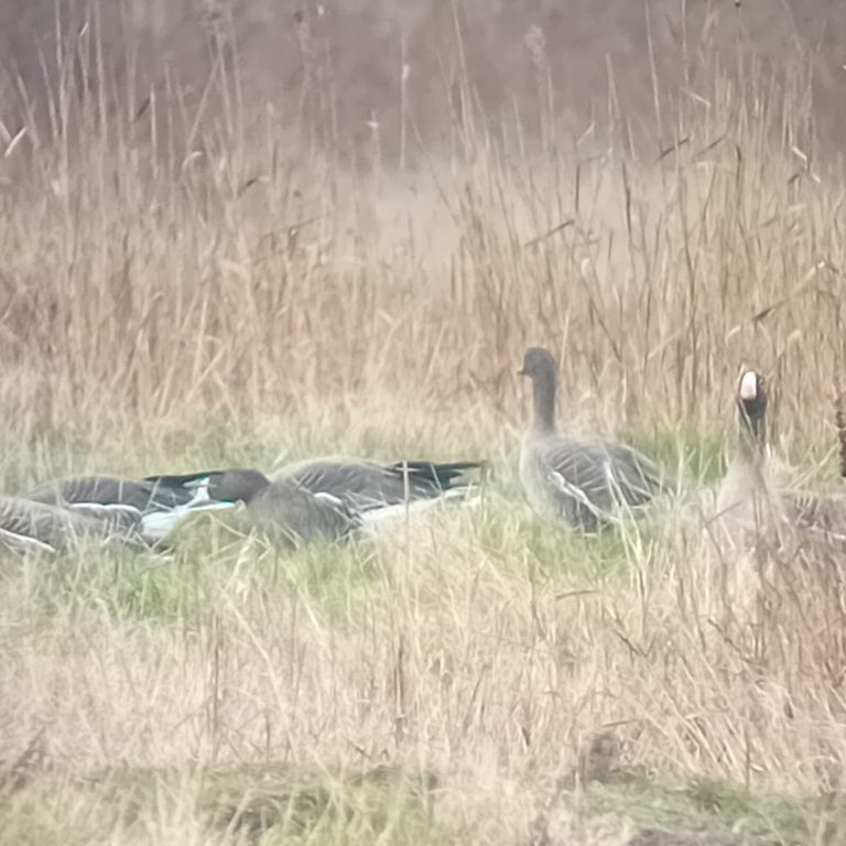 Fifteen members joined us at RSPB BMW and the snow/ice we had a few days before had all cleared, so we had a dry day with even a spot of sun at the start. Straightaway we had good views of a Kingfisher from the Visitor Centre and also a Great White Egret was on the ponds. We progressed past the Bunker Hide, newly refurbished which pleased Ian Bunker! In the gorse we saw a Goldcrest very close flitting about and a brief glimpse of a Sparrowhawk swooping along the hedges. In the fields were hundreds of Pink-footed Geese making a din, until they all flew up in a great spectacle.